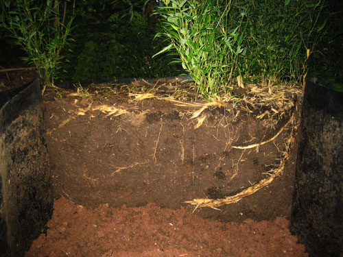 Variation - Hochbeet ![]() Bambus im Hochbeet Schema 1. Rasenniveau 2. Granit oder Sandstein (50x50x80cm Blöcke) 3. Zwischenschüttung (50 cm zw. Stein und Sperre) 4. Rhizomsperre (Durchmesser 1 x 2 Meter) ...innere Bepflanzung Die Zwischenschüttung (3.) kann problemlos bepflanzt werden Rechts: Einfassung Sandstein Alternative: Roter oder Grauer Granit |